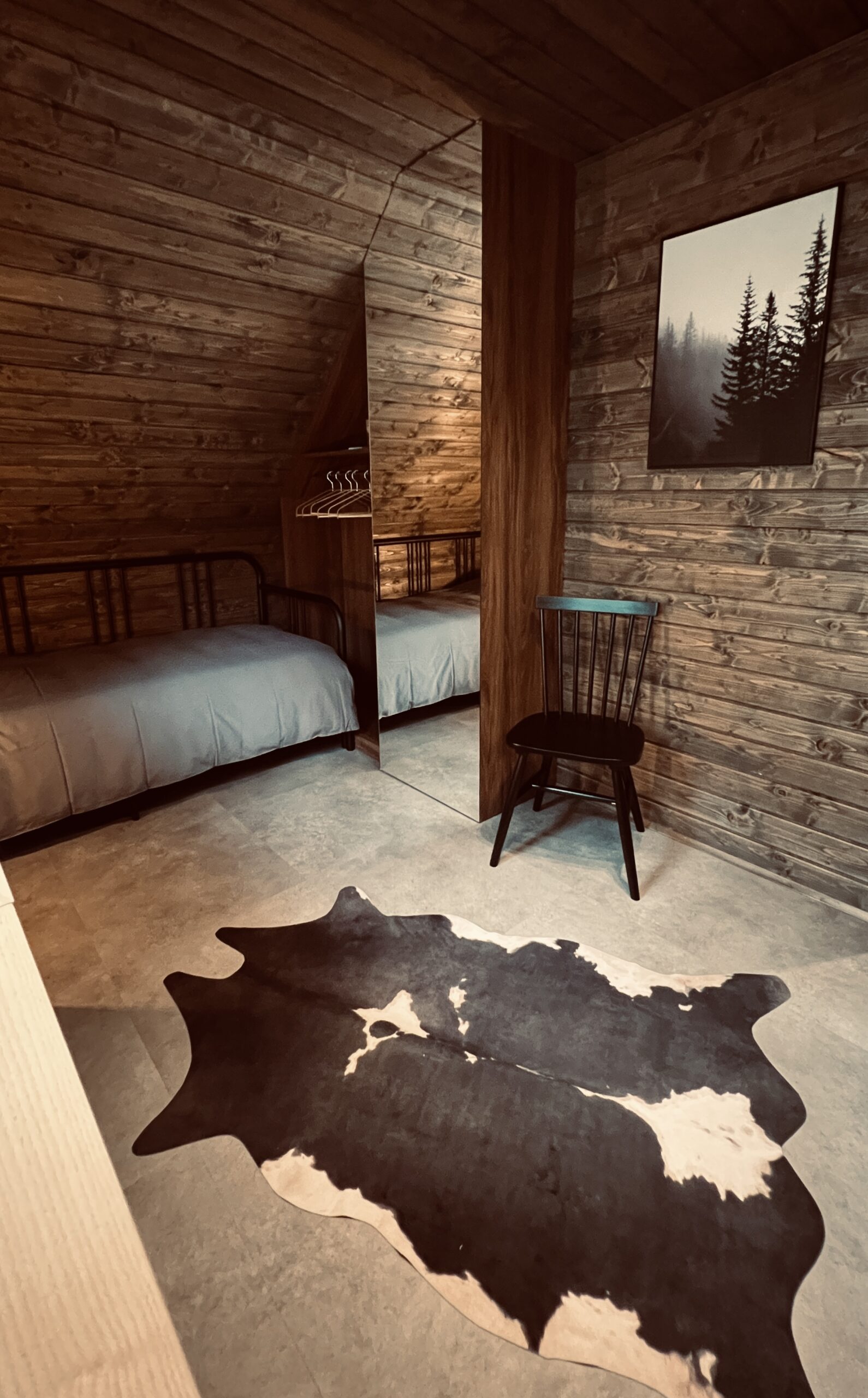 - Sypialnia 1 – główna sypialnia z dużym łóżkiem małżeńskim, na wyposażeniu pościel, szafa, fotel. Z sypialni roztacza się bajeczny widok na las i gwieździste niebo.